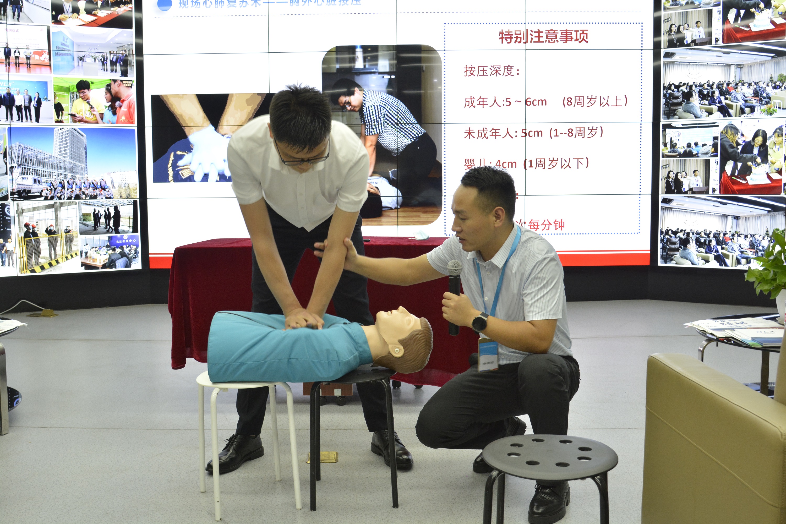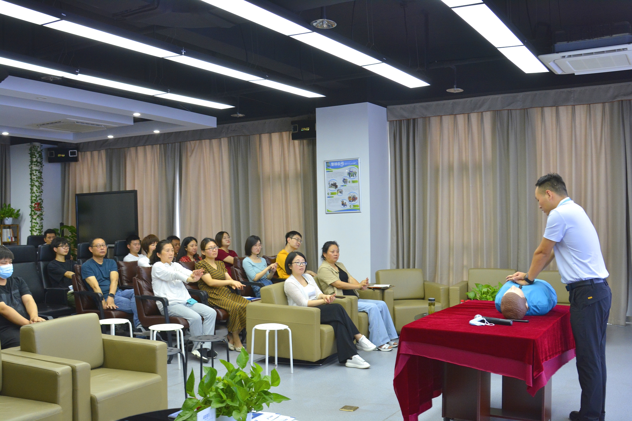 活動(dòng)中,任樂義老師生動(dòng)幽默地為大家講解了突發(fā)意外傷害的急救處理方法,并現(xiàn)場演示了心肺復(fù)蘇術(shù)、人工呼吸、海姆立克急救法等相關(guān)救護(hù)操作,同時(shí)給大家普及了重大疾病案例分析及預(yù)防措施、亞健康、慢性疾病的預(yù)防,包括肺癌、肝癌、胃癌、宮頸癌、慢性病等早期信號及預(yù)防方法。同事們認(rèn)真聆聽,細(xì)心觀看,還現(xiàn)場進(jìn)行了操作演練。